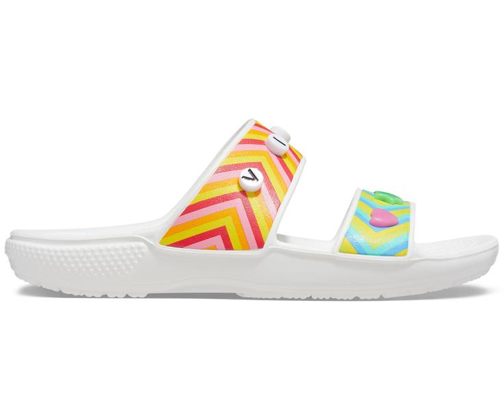 The look and feel of our comfortable Classic Clog and Crocs Slide, now in sandal form. Two upper straps offer even more comfort and foot security. This special pairs has been upgraded to offer a playful festival vibe with rainbow printed straps, and removeable Jibbitz™ charms. Original Croslite™ foam cushion will keep you supported while you’re rocking out.
